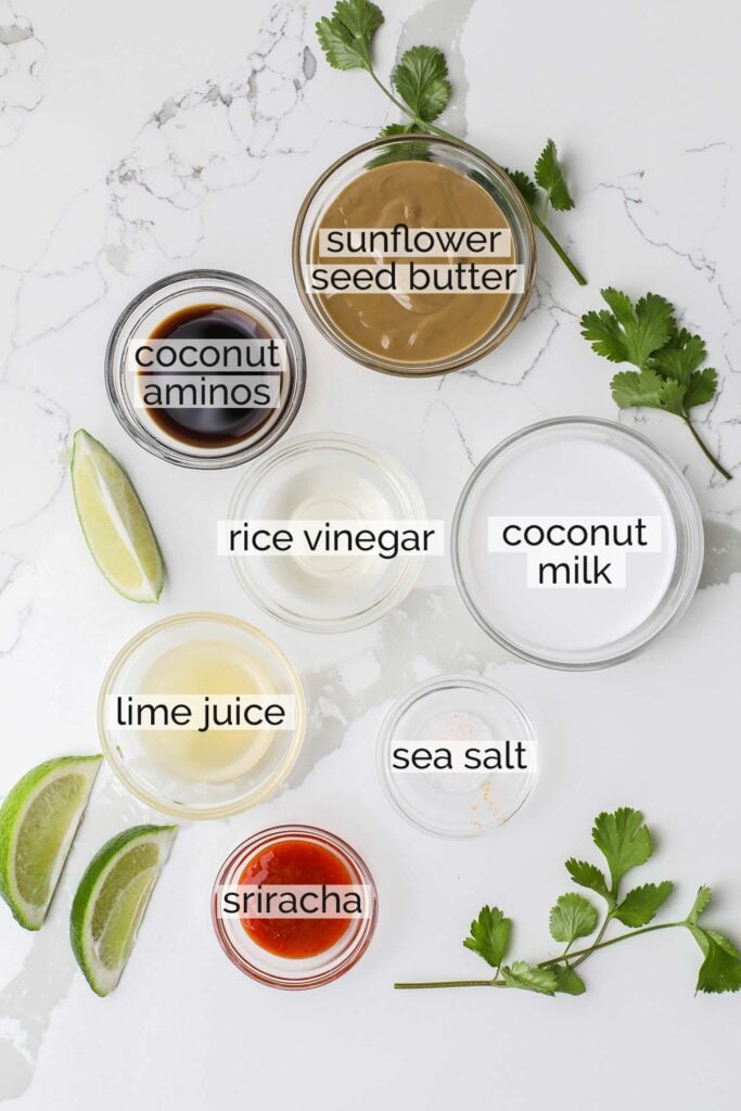 I fell in love with this sauce years ago, and now use it for a variety of Thai-inspired recipes. It’s creamy and sweet from the coconut milk, and sunflower seed butter gives it a nutty flavor. It gets some zing from rice wine vinegar and lime juice, and some spice from sriracha.