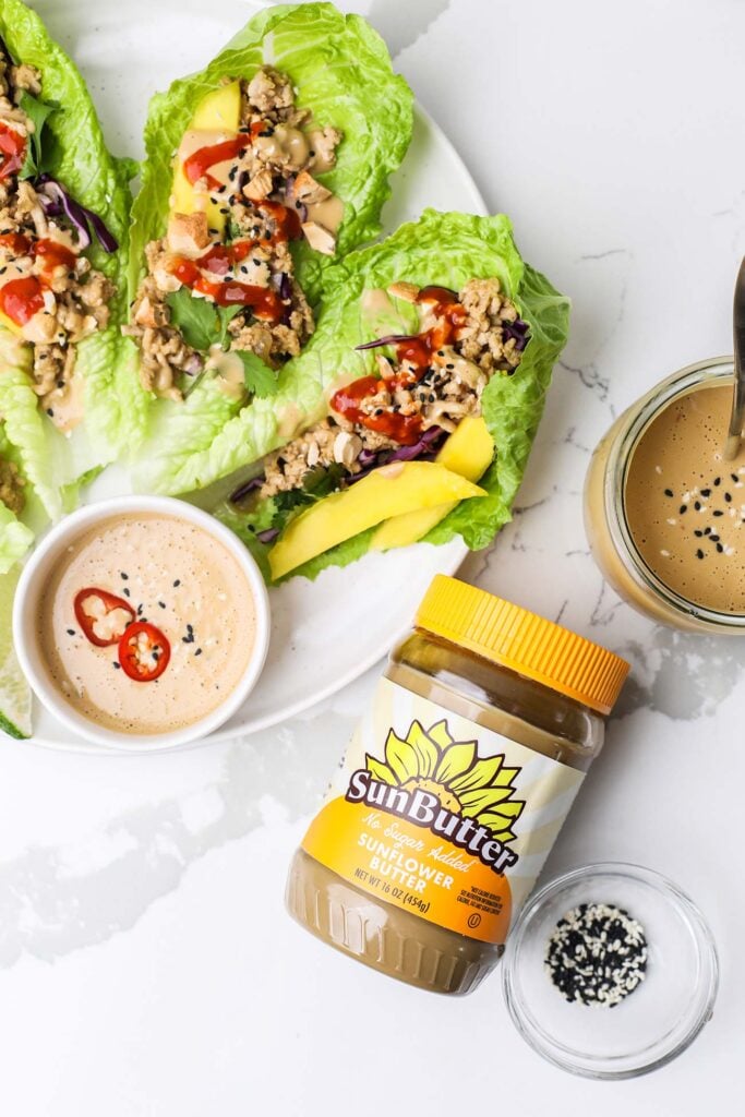 Make these Nut Free: These are nut free if you use sunflower seed butter in the Thai lettuce wrap dipping sauce and top them with toasted sunflower seeds.